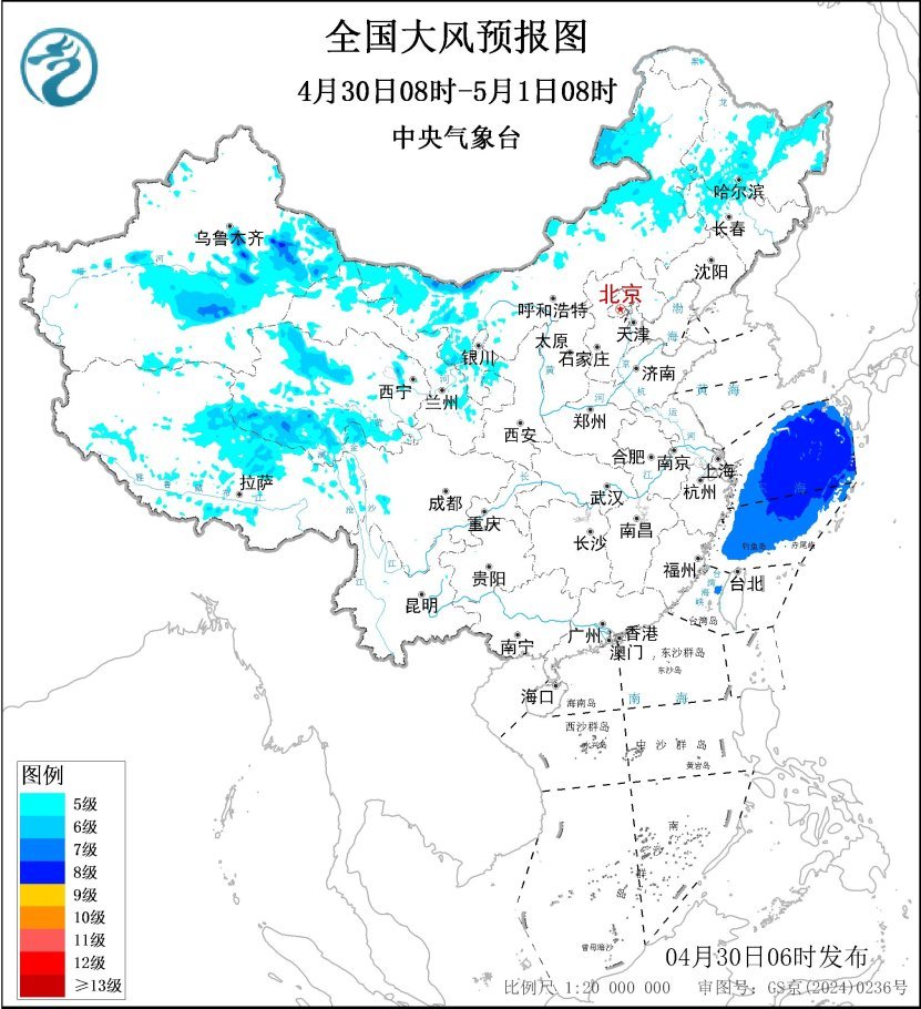 预计,4月30日08时至5月1日08时,新疆东部和南疆盆地、青海西北部和南部、西藏北部、甘肃西部、宁夏、内蒙古西部和东北部、黑龙江中部、吉林西部等地部分地区有5~6级风,阵风7~8级,其中,新疆东部山口地区风力可达7~8级,阵风9-10级;东海大部海域将有7~8级、阵风9~10级的大风。